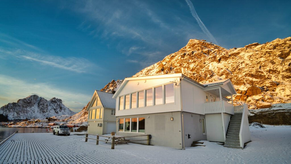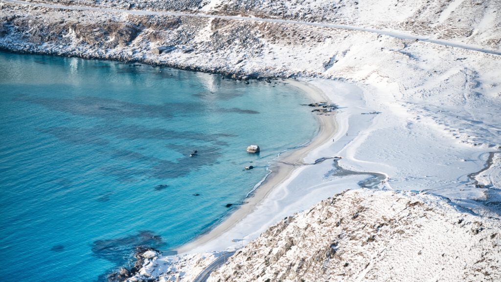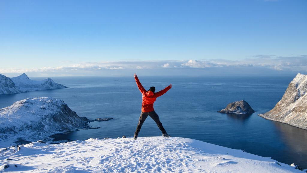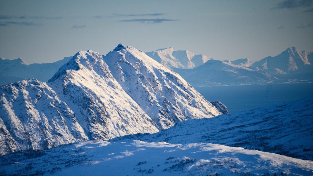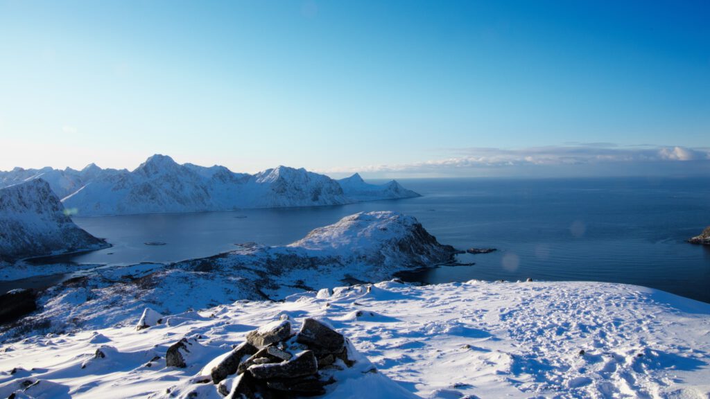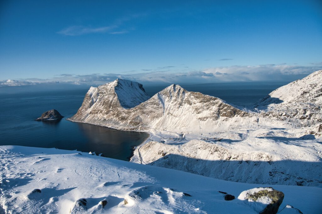 Der Wetterbericht auf YR.no versprach einen schönen Tag und so sollte der auch im Winter relativ leicht zu besteigende Holandsmelen nördlich von Leknes das Tagesziel sein. Mit eine Höhe von 434 m bietet er schon sehr schöne Aus- und Tiefblicke. Außerdem steht er noch nicht in jedem Reiseblog bzw. jeder Instastory (verdient hätte der Berg das 😉 ) und so hatten wir den Gipfel dann auch für uns allein.