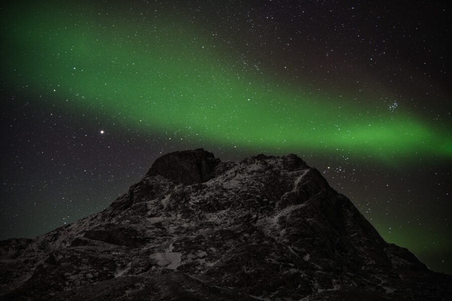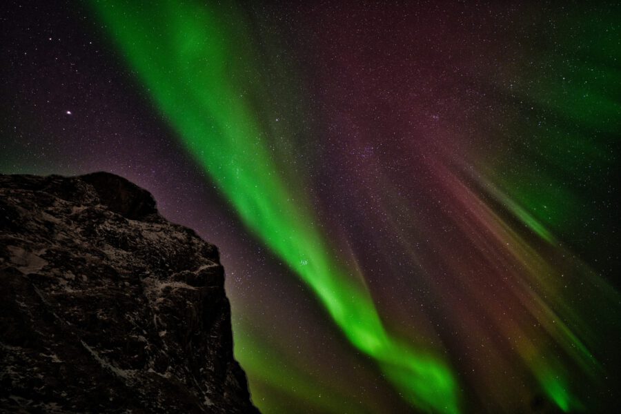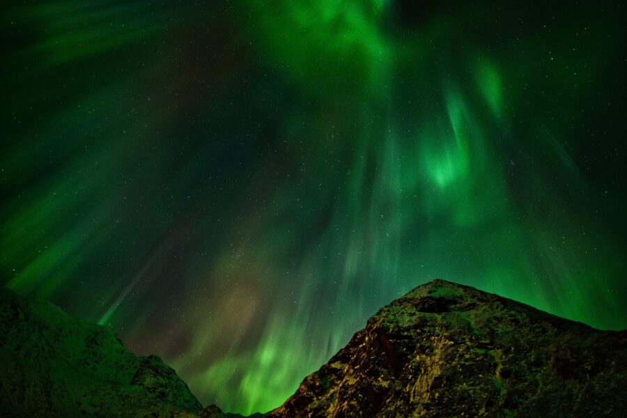Abends zeigten sich noch einige, zuerst schwache Polarlichter am Himmel. Kurz entschlossen sind wir ein gute halbe Stunde zum Strand von Uttakleiv auf die Nordseite der Loften gefahren und konnten beeindruckende Polarlichter beobachten und fotografieren: