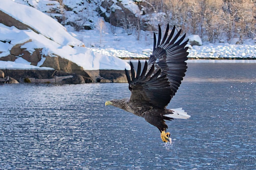 Alle Fotos haben wir natürlich selbst gemacht. Wir kamen den Vögeln sehr nahe und die Guides haben gelegentlich mit ein paar ins Wasser geworfenen Fischen „nachgeholfen“, sodass auch Fotos von Adlern möglich waren, die Beute aus dem Wasser holen. Jungvögel leben, wie schon beschrieben, in größeren Gruppen zusammen und vielleicht haben sich die Vögel auch an die Boote mit den seltsamen Leuten in den gelben Anzügen gewöhnt.
