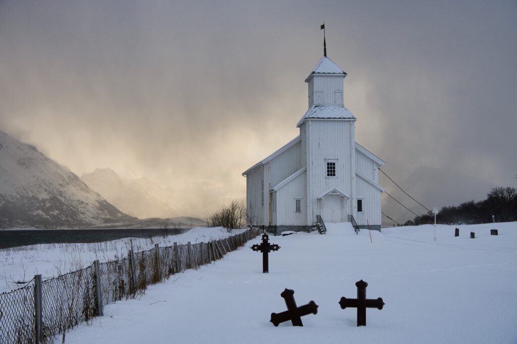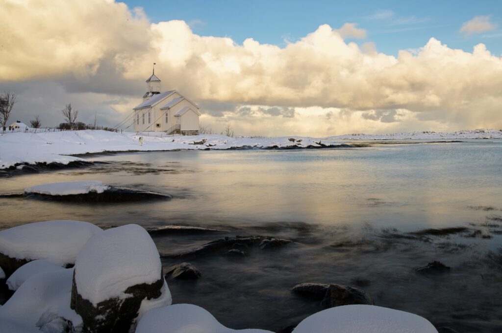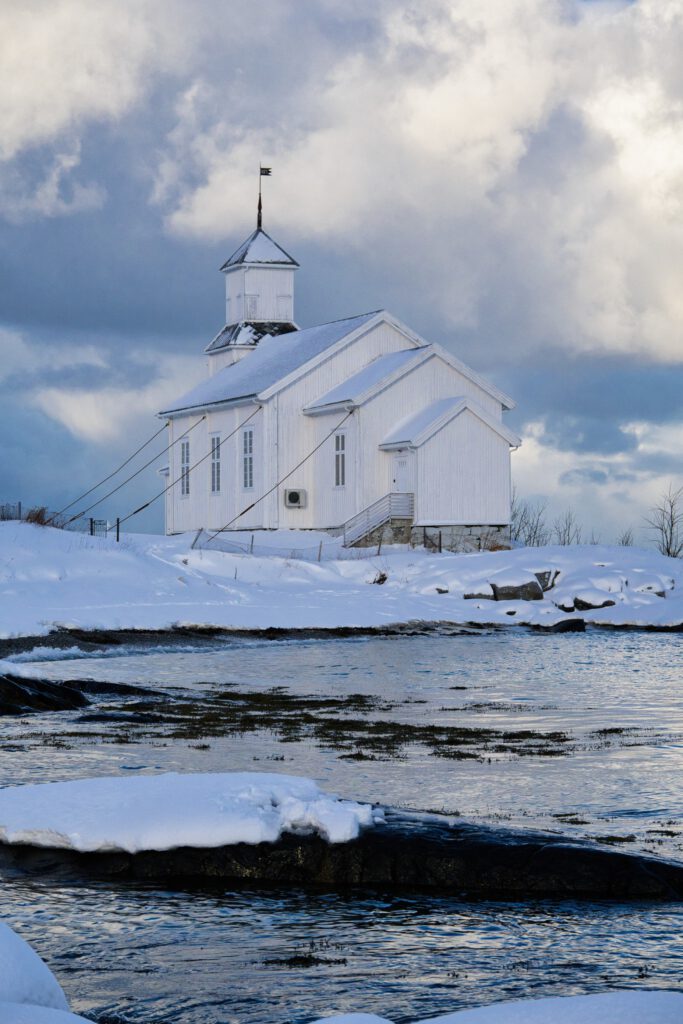 Unser erster Stopp war die Kirche von Gimsøy, eine 1876 erbaute Holzkirche, die direkt an der Küste liegt.
