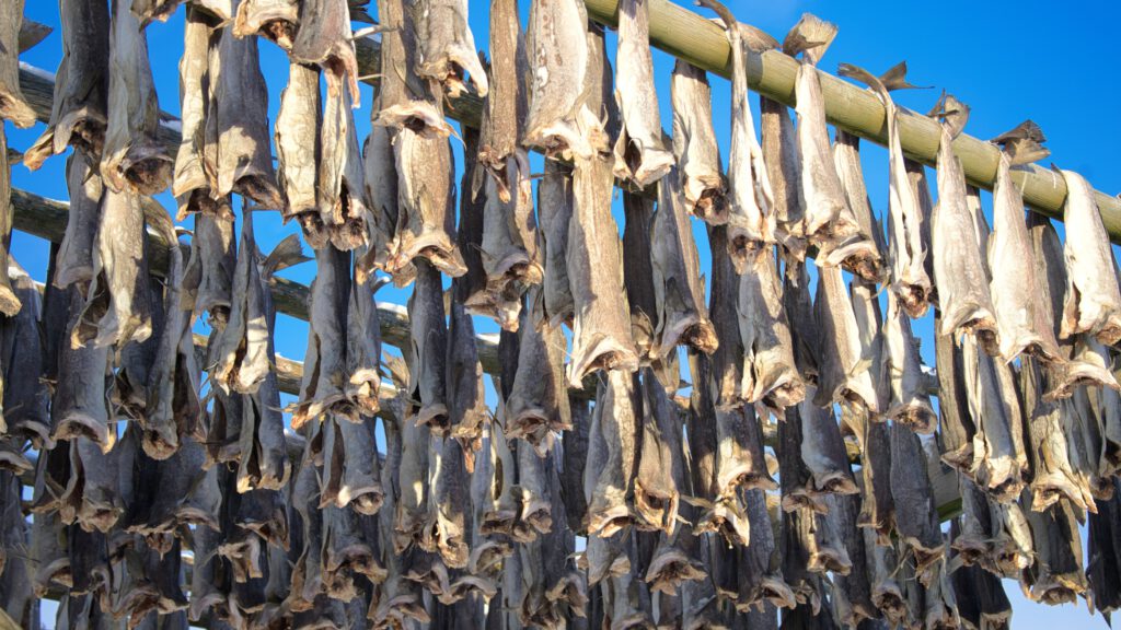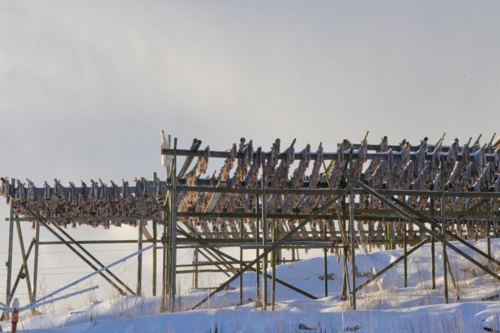 Der Geruch ist übrigens „beeindruckend“. Jedenfalls kann man den fischigen Geruch schon vernehmen, ohne die Stockfischgestelle erblickt zu haben. In Nordnorwegen sagt man, dass das der Geruch des GELDES ist!