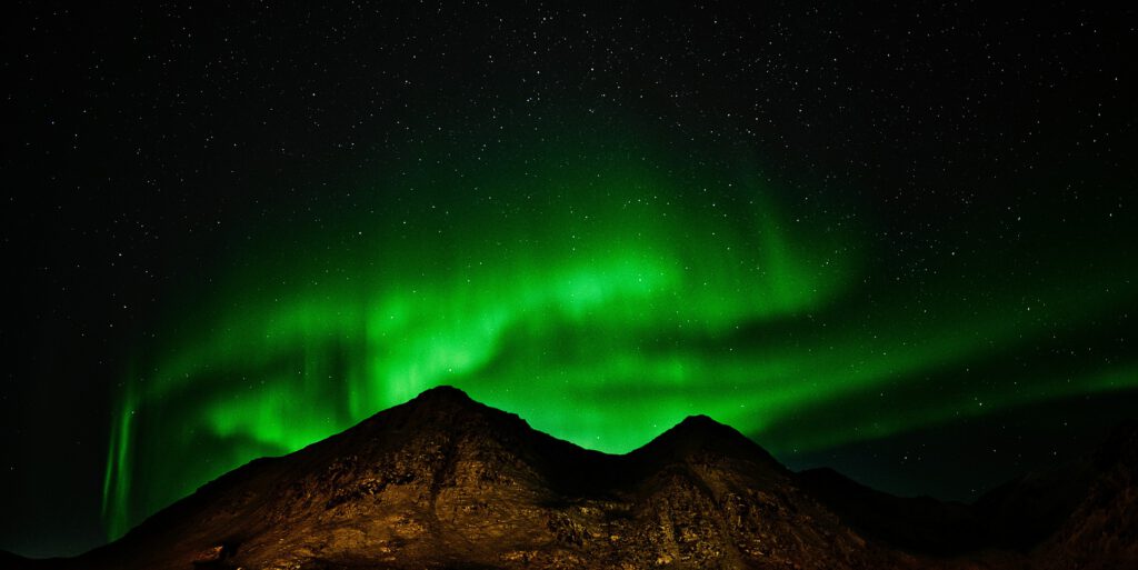 Miriam hat ja immer einen Blick auf die Polarlichtvorhersage! Und so sind wir gegen 22 Uhr noch mal kurz vor die Tür und siehe da: Es gab Polarlichter. Und auch wenn die Umgebung um unsere Unterkunft nicht die besten Bedingungen bietet, sind doch ein paar schöne Aufnahmen dabei herausgekommen:
