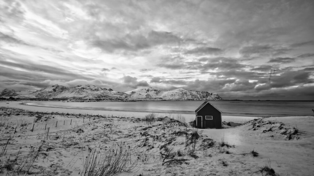 Oft fotografiert: Die unter Fotografen bekannte „red Cabin“ am Rambergstranda – hier mal schwarzweiß interpretiert 🙂
