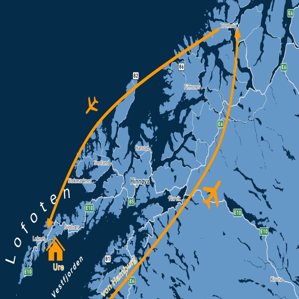 Flugzeit Hamburg – Tromsö 3 h, Tromsö – Leknes 1 h. Da es zwei unabhängige Flüge waren, war das ganze Prozedere (Aufgabegepäck einchecken, Sicherheitskontrolle …) zweimal zu durchlaufen. Insbesondere die Sicherheitskontrolle macht mit Handy, Laptop und der inzwischen recht umfangreichen Fotoausrüstung nicht wirklich Spaß.