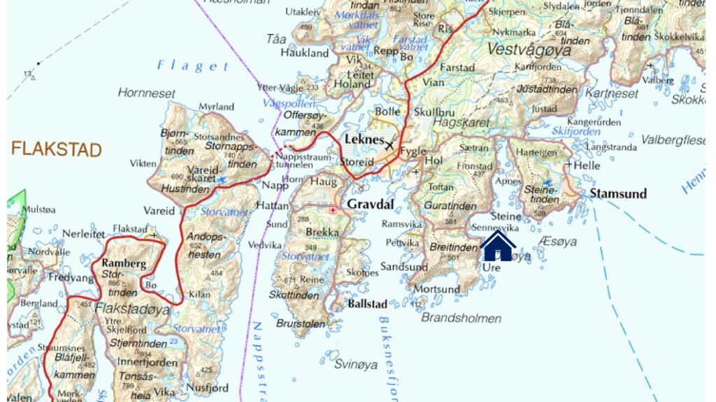 Karte unten: Lage unserer ersten Unterkunft auf den Lofoten südöstlich von Leknes im Örtchen Ure.